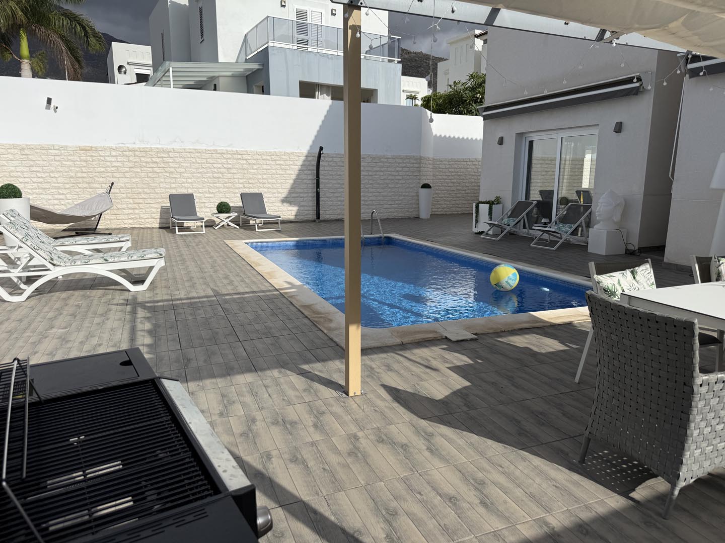 Enjoy a central stay in Costa Adeje close to everything! This family-friendly house features a front play area, baby gates, toys, BBQ, air con throughout, high speed wifi and outdoor dining with views of two pools on the complex , with sunbeds for everyone!
