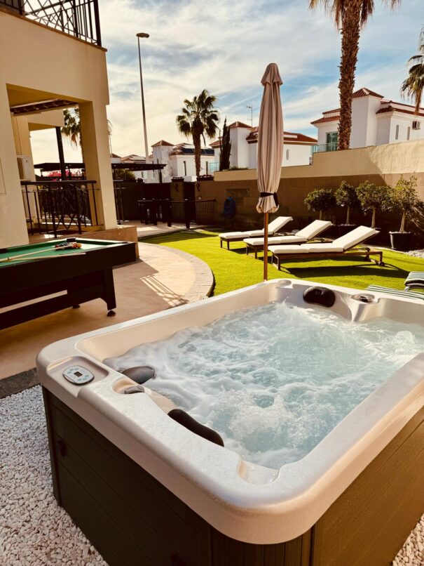 This beautiful Villa with its 5 bedrooms, 6 beds plus 1 bed settee, 2 kitchens, beautiful full sized heated pool (9mtrs x 4.5), lovely 6 person luxury hot tub , full sized BBQ, under the stars Gym area, games room – a full sized American Pool Table must be the best villa for families and groups in the whole of Tenerife. 12 guests 5 bedrooms 7 beds 2.5 bathrooms