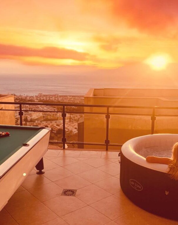 Panoramic sunset ocean view pool residence with 3 bedrooms with 6 beds Imagine your mornings sat on one of the 2 large balconies enjoying breakfast in the sun. Then a lazy afternoon in the lovely pool and later – evening drinks on the balcony watching sunsets from your jacuzzi. With en-suite bedrooms, dining for 13 on a choice of 4 tables. A large BBQ, Full sized American pool table, outdoor mini gym etc. 11 guests – 3 bedrooms – 5 beds – 3 bathrooms