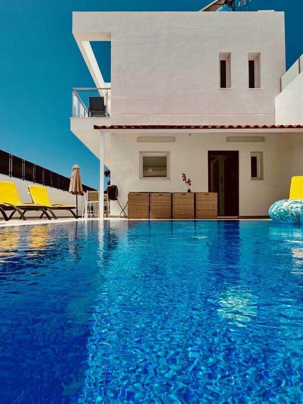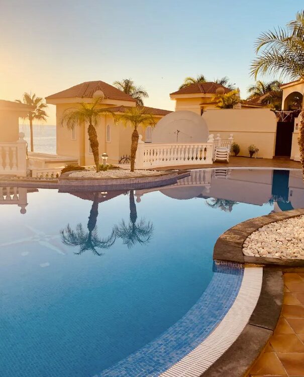 Imagine being able to dive into the ocean within 60 seconds of walking from your villa door. Beach Front Sunset View Villa has the best location in the whole of Tenerife. Tucked away on its own quiet secret beach, but within minutes of the main town of Los Cristianos. 12 guests – 3 bedrooms – 5 beds – 3 bathrooms